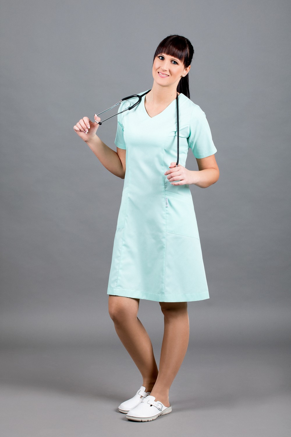 A rövid ujjú, V-nyakú kivágású, karcsúsított felsőrész és lefelé enyhén bővülő szabás elegáns megjelenést biztosít, miközben szabad mozgást nyújt a hosszú műszakok alatt is. A felsőrész két praktikus zsebbel készült, amelyek mindennapi munkához szükséges eszközök tárolására alkalmasak. A hátoldalon található rejtett cipzár megkönnyíti a felvételt, és diszkrét, igényes megoldást biztosít.