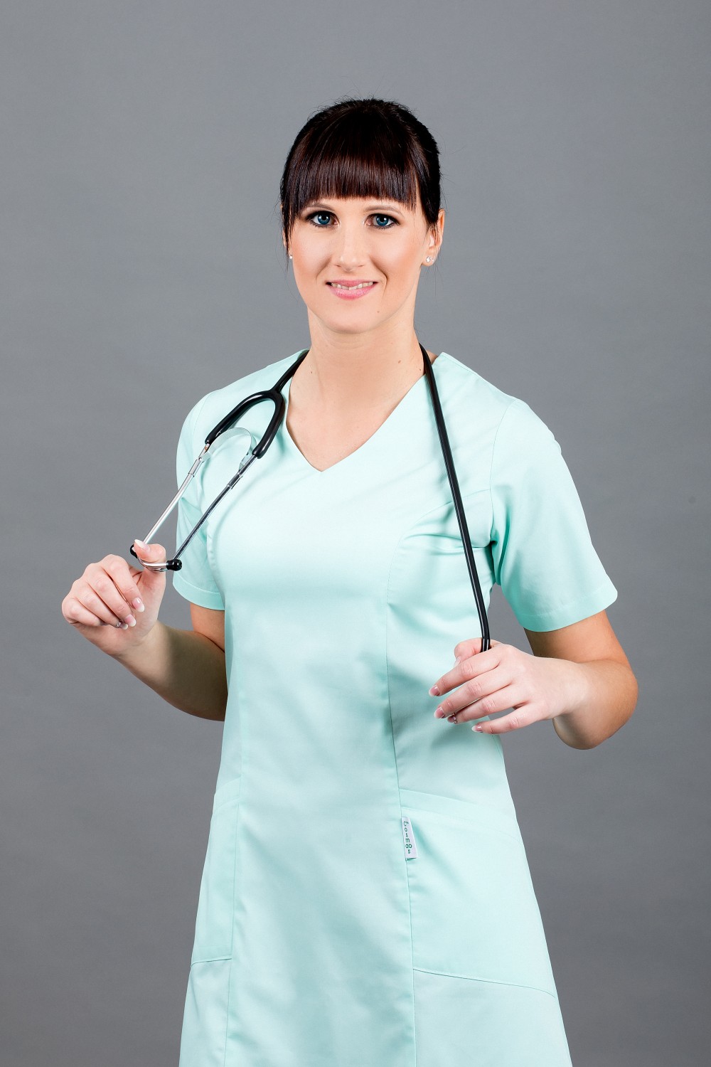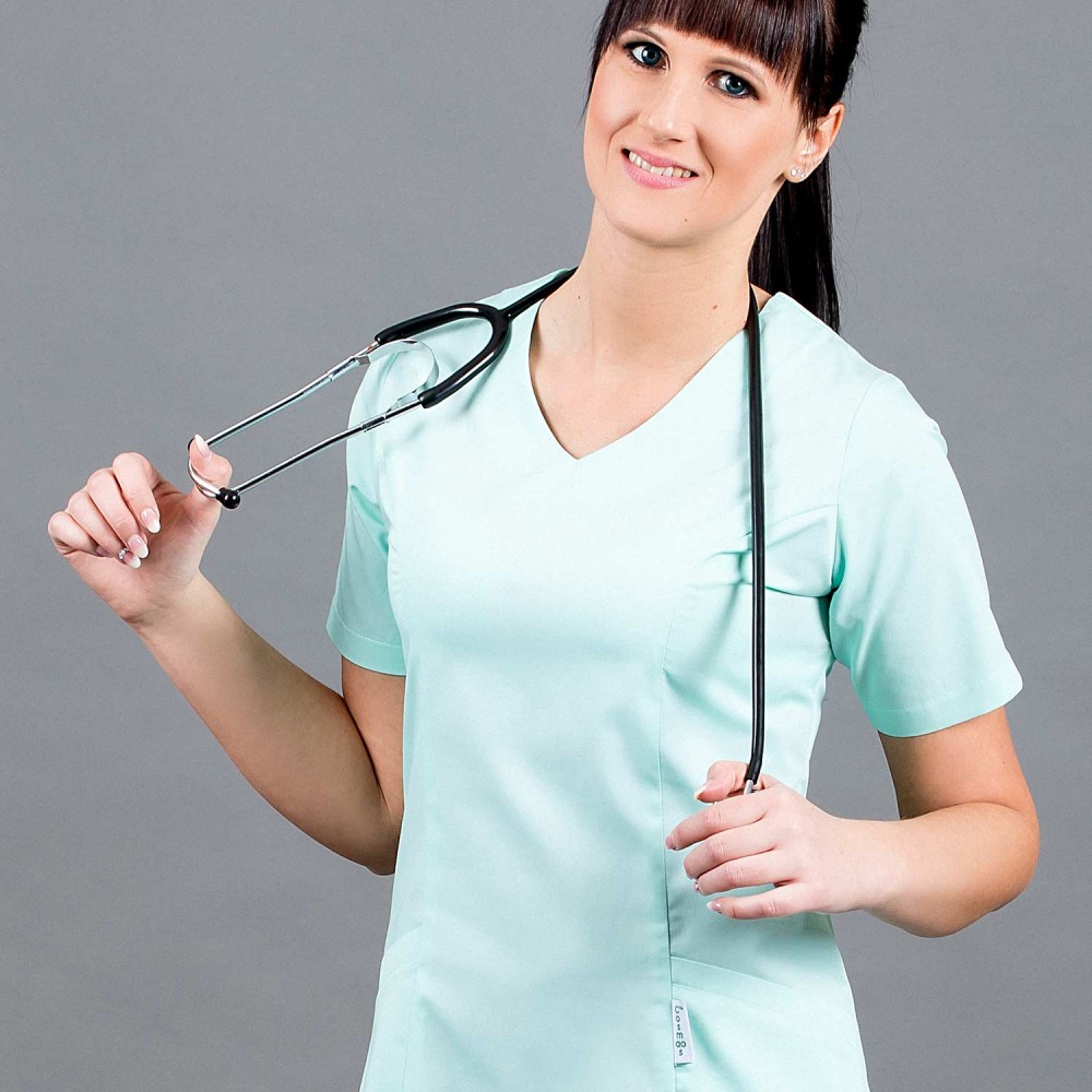 A rövid ujjú, V-nyakú kivágású, karcsúsított felsőrész és lefelé enyhén bővülő szabás elegáns megjelenést biztosít, miközben szabad mozgást nyújt a hosszú műszakok alatt is. A felsőrész két praktikus zsebbel készült, amelyek mindennapi munkához szükséges eszközök tárolására alkalmasak. A hátoldalon található rejtett cipzár megkönnyíti a felvételt, és diszkrét, igényes megoldást biztosít.